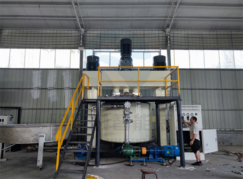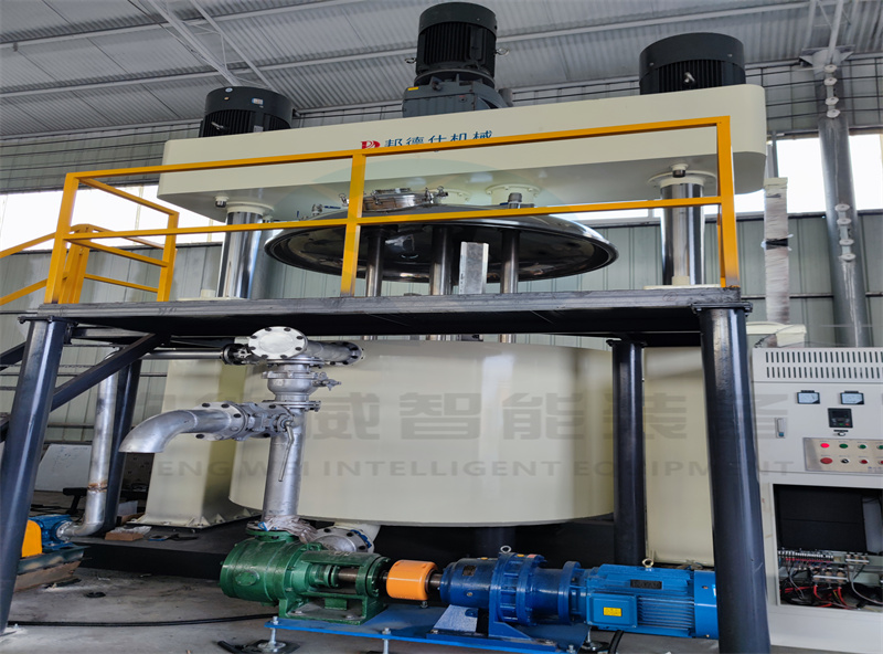2.半自動線生產:計量斗、稱重和輸送系統、儲罐、5000L分散機預混基料、自動投粉、烤箱烘干、3000L、2000L、1100L行星、動混、強分進行制膠,配套真空、冷卻裝置,完成分散、混合、真空工序,進行生產。此工藝產量穩定,適合中大規模投產。